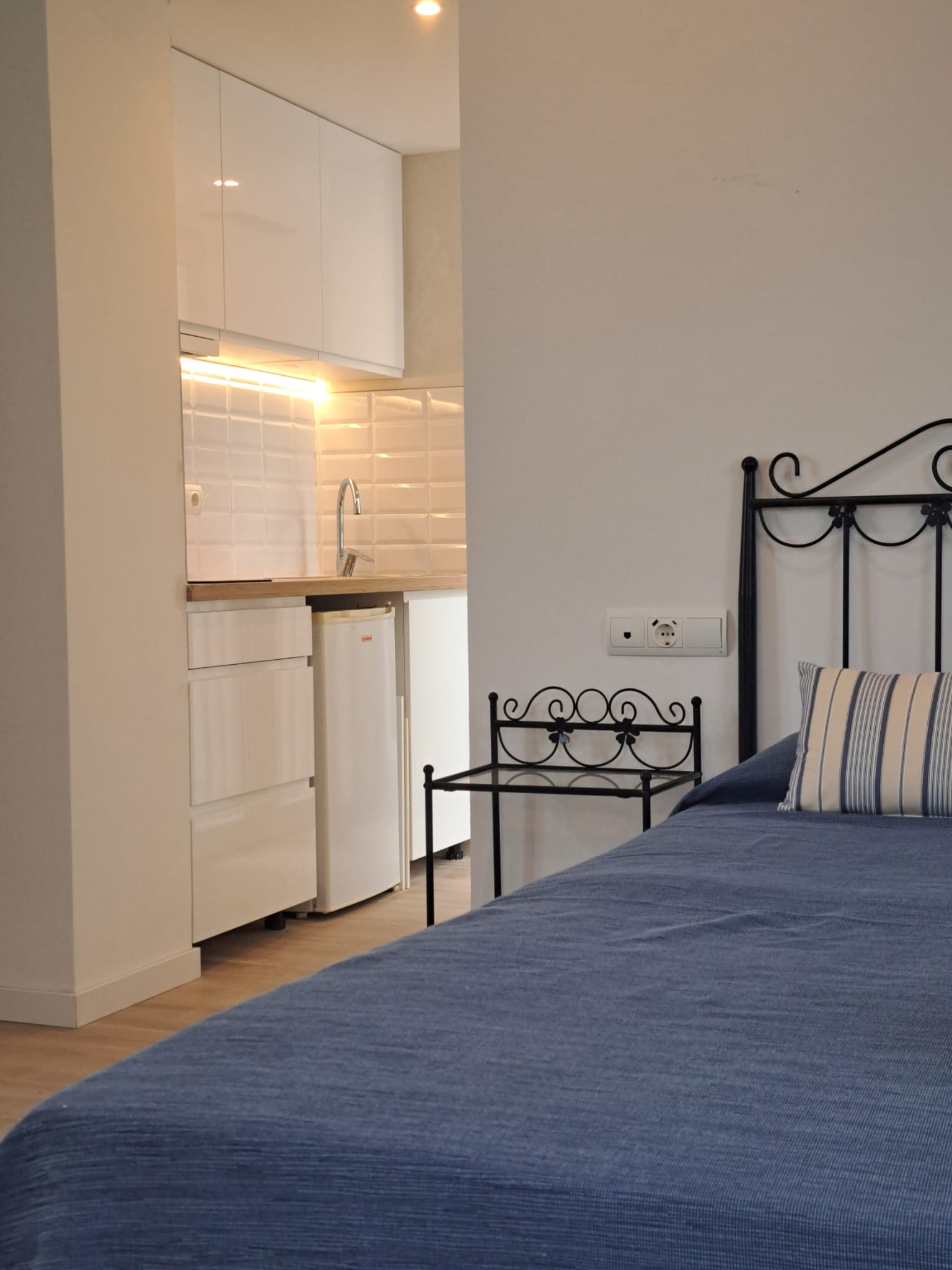Habitación de 25 metros cuadrados con una cama de 1,5 x 2 metros, cocina completa.